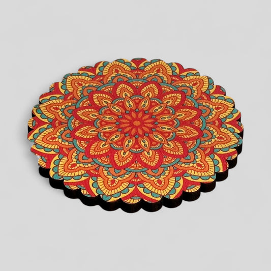 6 Pack Turkish Wooden Coaster Set with Holder - Red, Orange, Blue -- Warm Tone Mandala -- Made in Turkey