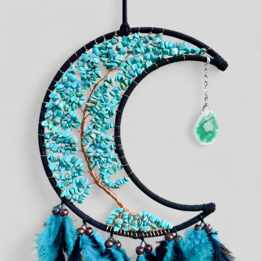 Attrape-rêves en croissant de lune à suspendre au mur de taille moyenne avec pierres turquoise et breloque en pierre suspendue avec plumes noires turquoise, décoration d'intérieur moderne