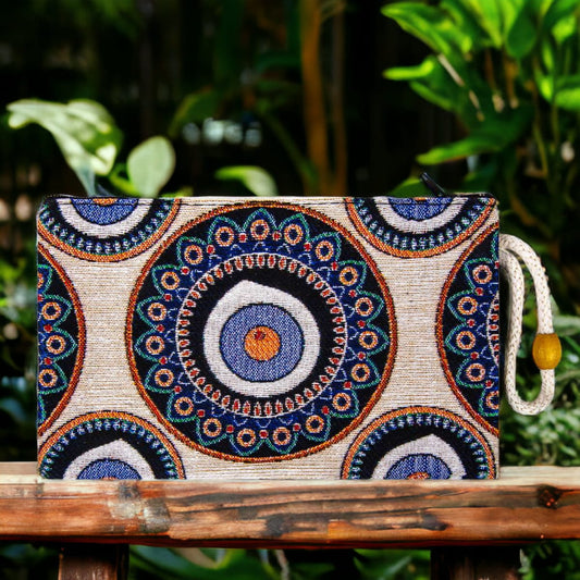 Authentique Kilim Tissu Blue Evil Eye Mandala Design Zipper Clutch Purse, Tapis turc, Pochette, Porte-monnaie, Portefeuille, Petit rangementPrix habituel $20Prix habituelPrix unitaire / par