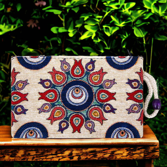 Authentique Kilim Tissu Ottoman Evil Eye & Tulips Design Zipper Clutch Purse, Tapis turc, Pochette, Porte-monnaie, Portefeuille, Petit RangementPrix habituel $20Prix habituelPrix unitaire / par-