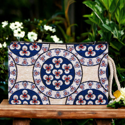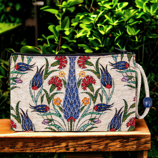 Authentique Kilim Tissu Ottoman Tulips Design Zipper Clutch Purse, Tapis turc, Pochette, Porte-monnaie, Portefeuille, Petit rangement -- Tulipes bleuesPrix habituel $20Prix habituelPrix unitaire / par-