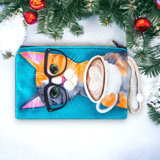 Tissu coloré moderne chat Art Design fermeture éclair pochette sac à main, turc, pochette, porte-monnaie, portefeuille, petit rangement, maman chat, chat buvant lattePrix habituel $15Prix habituelPrix unitaire / par-