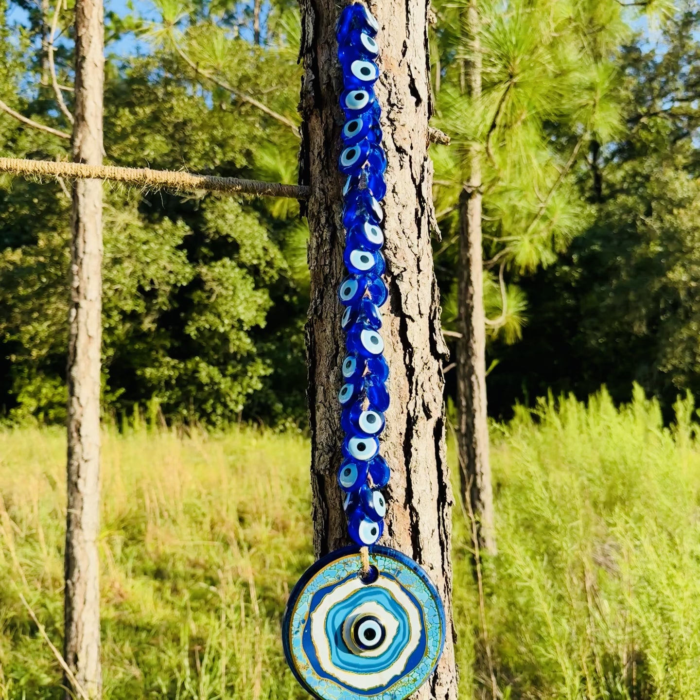 This wall hanging evil eye featuring 41 total evil eyes (40 on the macrame and 1 large blue) made of handblown glass is truly what you have been looking for! This extra large design has a dual layer gold trimmed main evil eye at the bottom.  Perfect for your home, office, or as a very special gift.