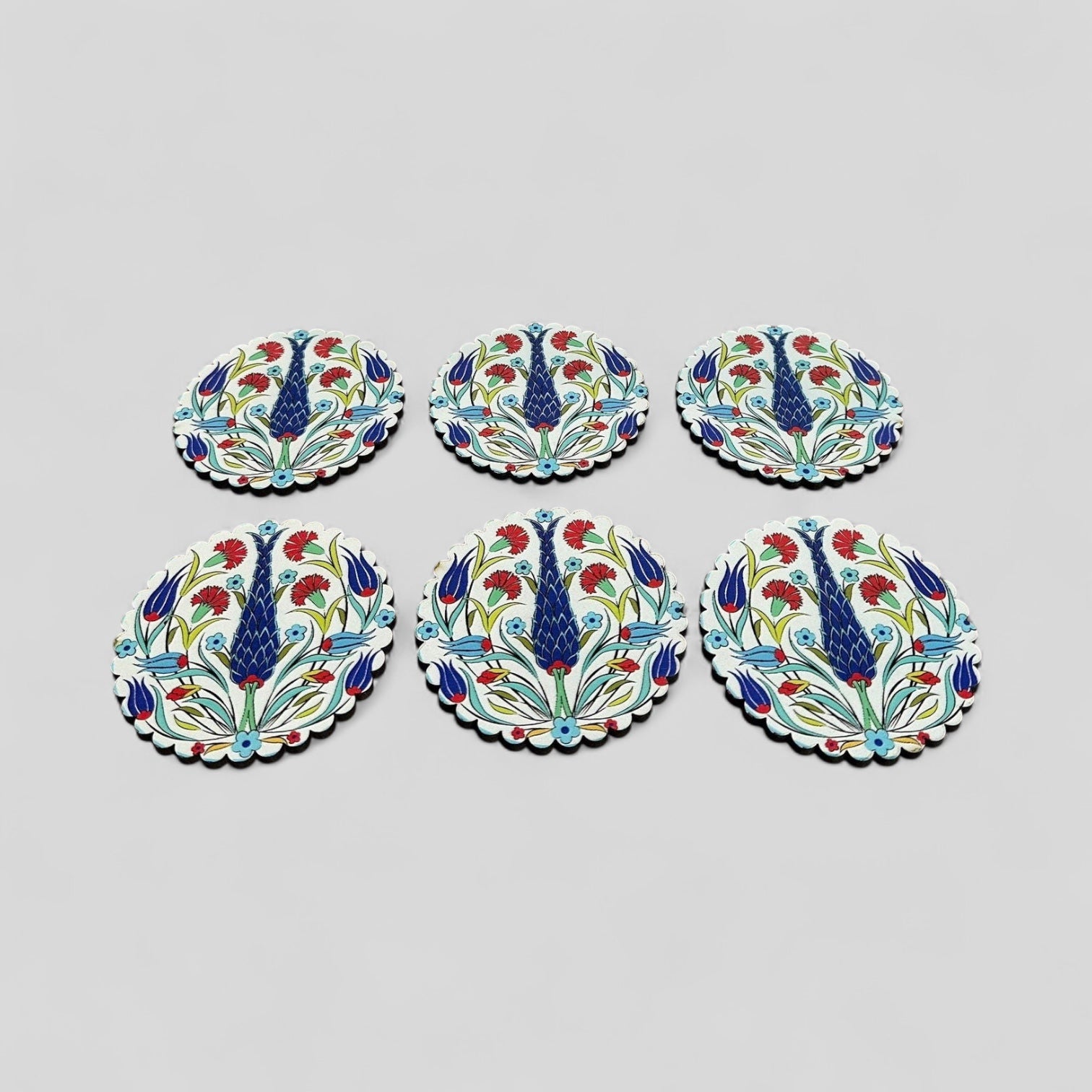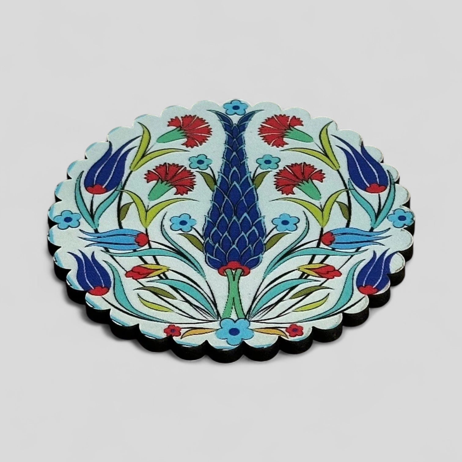 Lot de 6 dessous de verre turcs en bois avec support – Tulipes ottomanes bleues – Fabriqués en Turquie – Expédition rapide