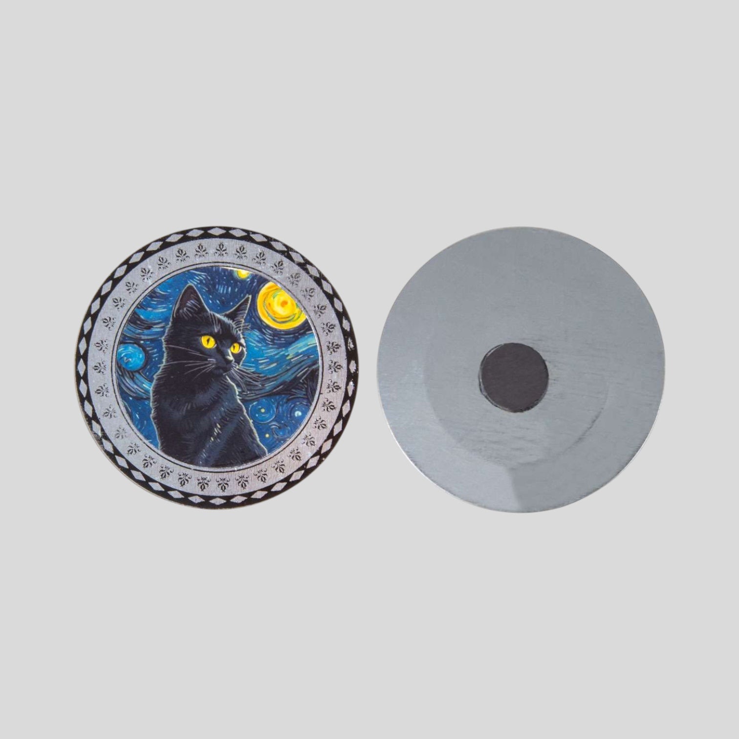 Introducing this adorable magnet featuring a black cats staring off into the starry night on a finished copper round. It's the perfect blend of whimsy and elegance, making it a delightful addition to your fridge or any magnetic surface. Bring a touch of feline magic to your space with this unique piece!