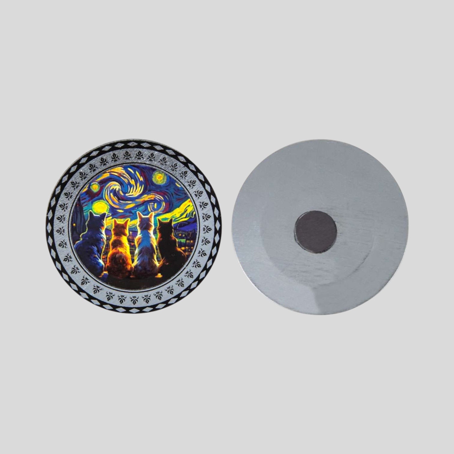 Introducing this adorable magnet featuring a group of cats staring off into the starry night on a finished copper round. It's the perfect blend of whimsy and elegance, making it a delightful addition to your fridge or any magnetic surface. Bring a touch of feline magic to your space with this unique piece!