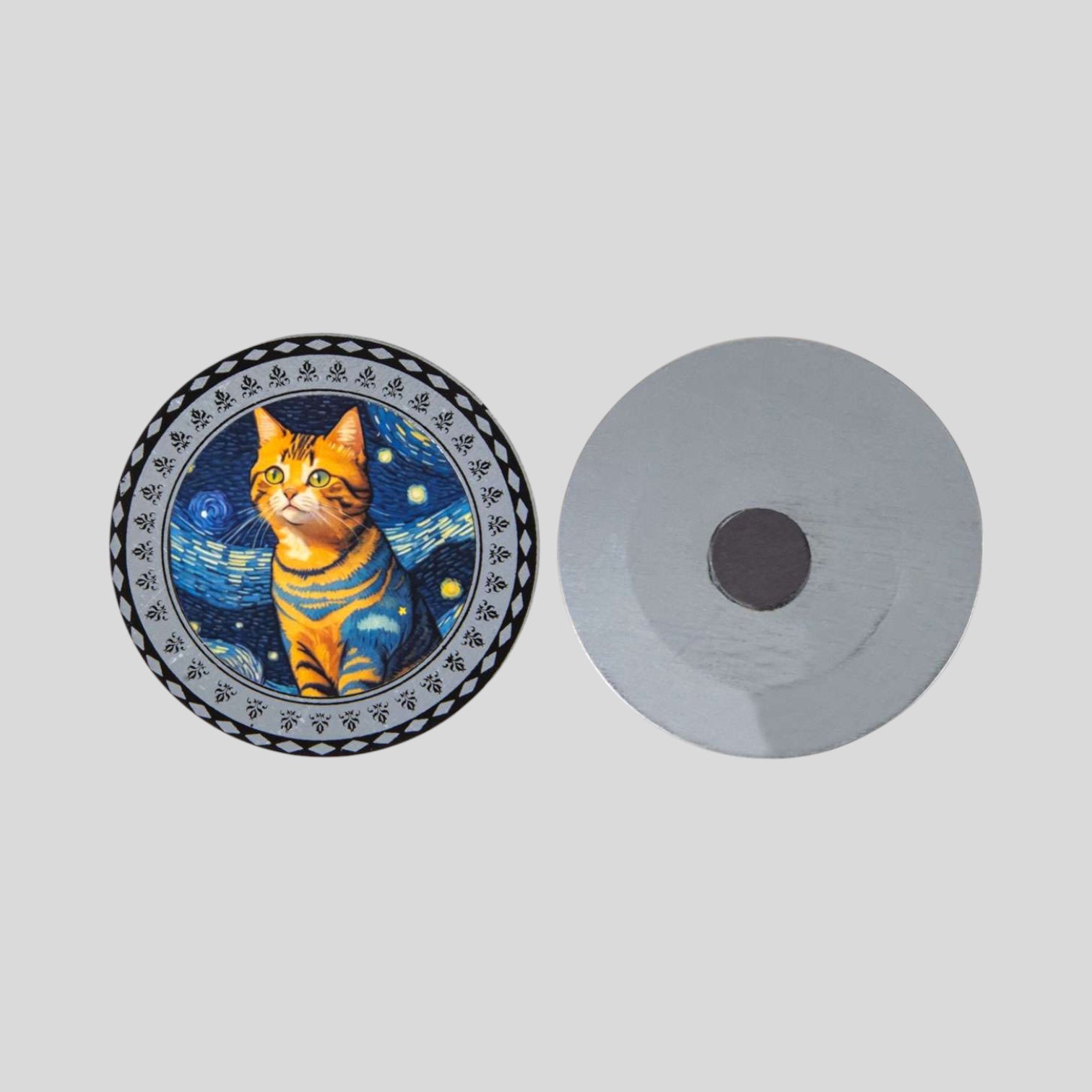 Introducing this adorable magnet featuring a charming cat perched on a finished copper round, all set against a mesmerizing starry night backdrop. It's the perfect blend of whimsy and elegance, making it a delightful addition to your fridge or any magnetic surface. Bring a touch of feline magic to your space with this unique piece!