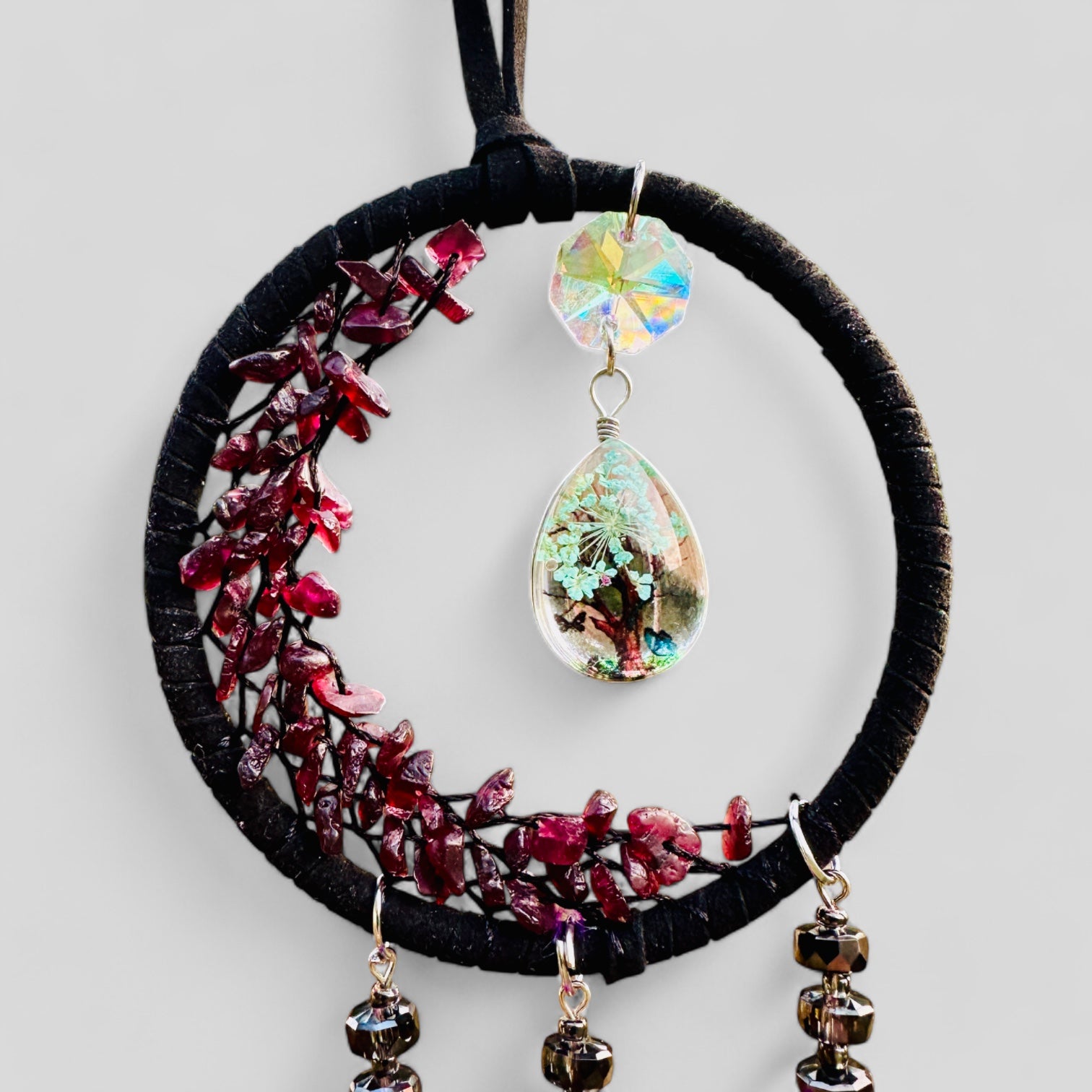 Il s’agit d’un capteur de rêves absolument magnifique et fait à la main qui peut être utilisé dans votre voiture ou votre maison. Il comporte un croissant de lune avec des pierres de couleur violet foncé profond avec un cristal suspendu avec un motif d'arbre à l'intérieur. Parfait pour votre véhicule, votre maison ou comme cadeau très spécial !