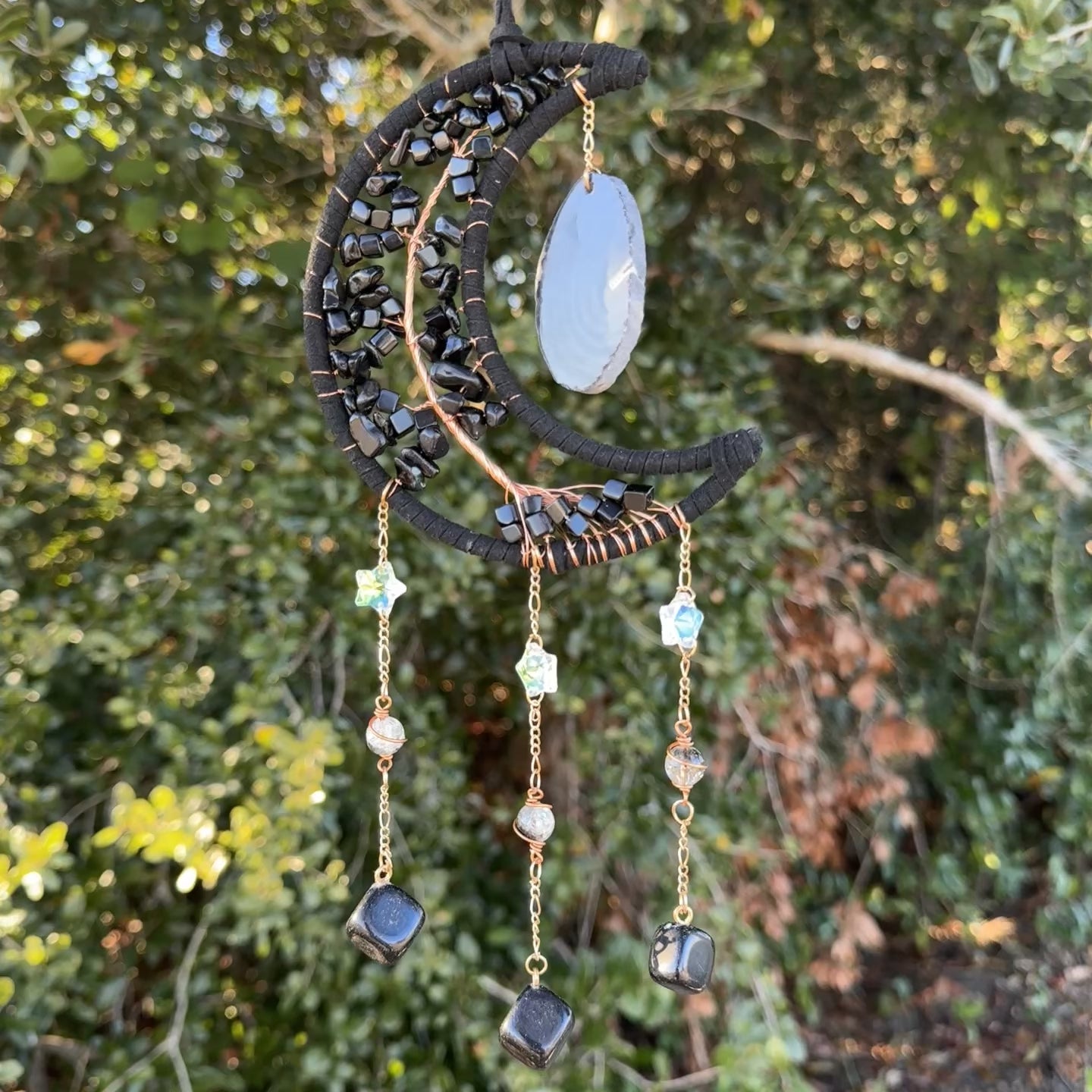 Il s’agit d’un capteur de rêves absolument magnifique et fait à la main qui peut être utilisé dans votre voiture ou votre maison. Il présente un style croissant de lune avec un arbre de vie fabriqué à partir de pierres d'aventurine et comporte 3 brins suspendus avec des pierres naturelles polies et des perles prismatiques. Parfait pour votre véhicule, votre maison ou comme cadeau très spécial !