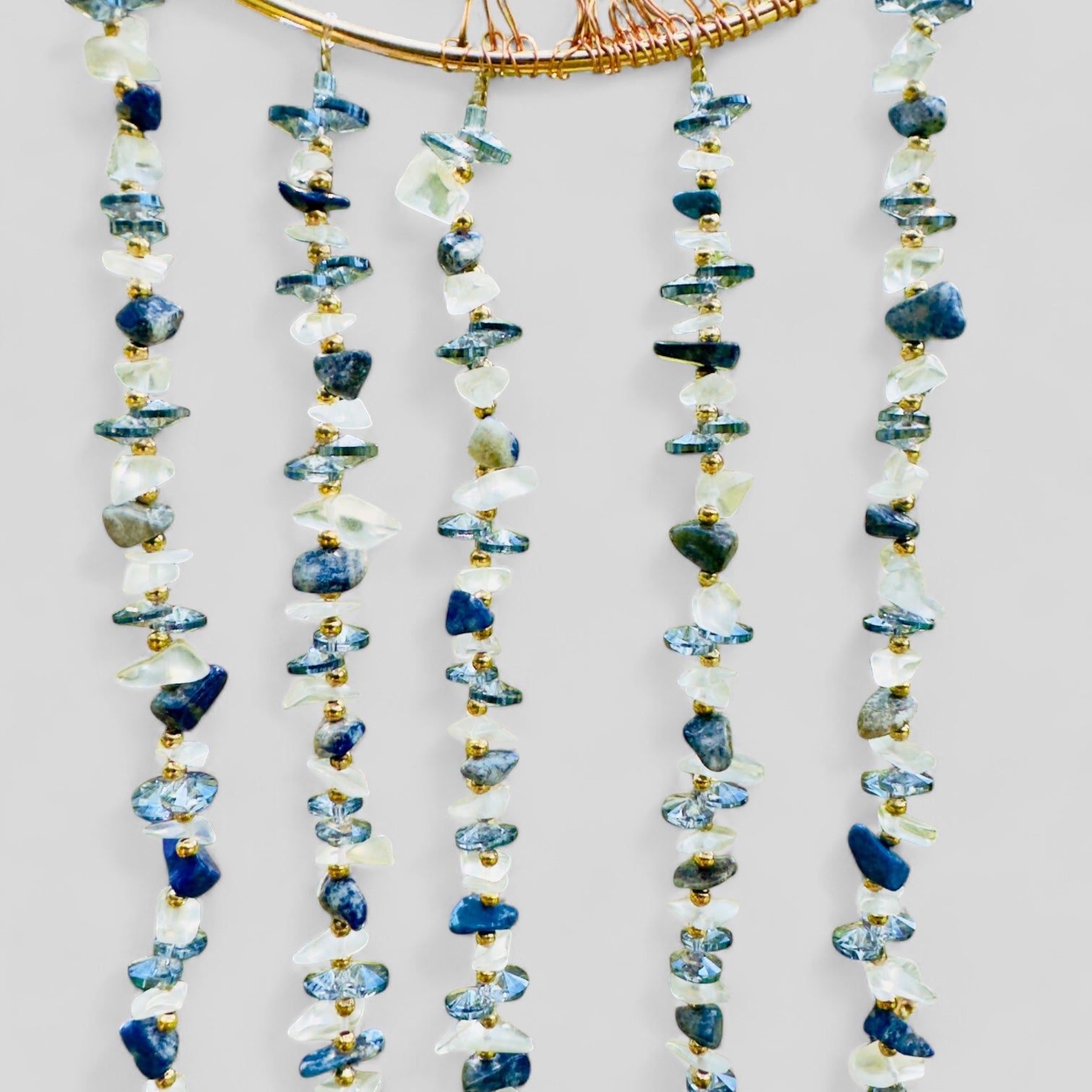 Il s’agit d’un capteur de rêves absolument magnifique et fait à la main qui peut être utilisé dans votre voiture ou votre maison. Il présente un style croissant de lune avec un arbre de vie fabriqué à partir de pierres d'aventurine et comporte 3 brins suspendus avec des pierres naturelles polies et des perles prismatiques. Parfait pour votre véhicule, votre maison ou comme cadeau très spécial !