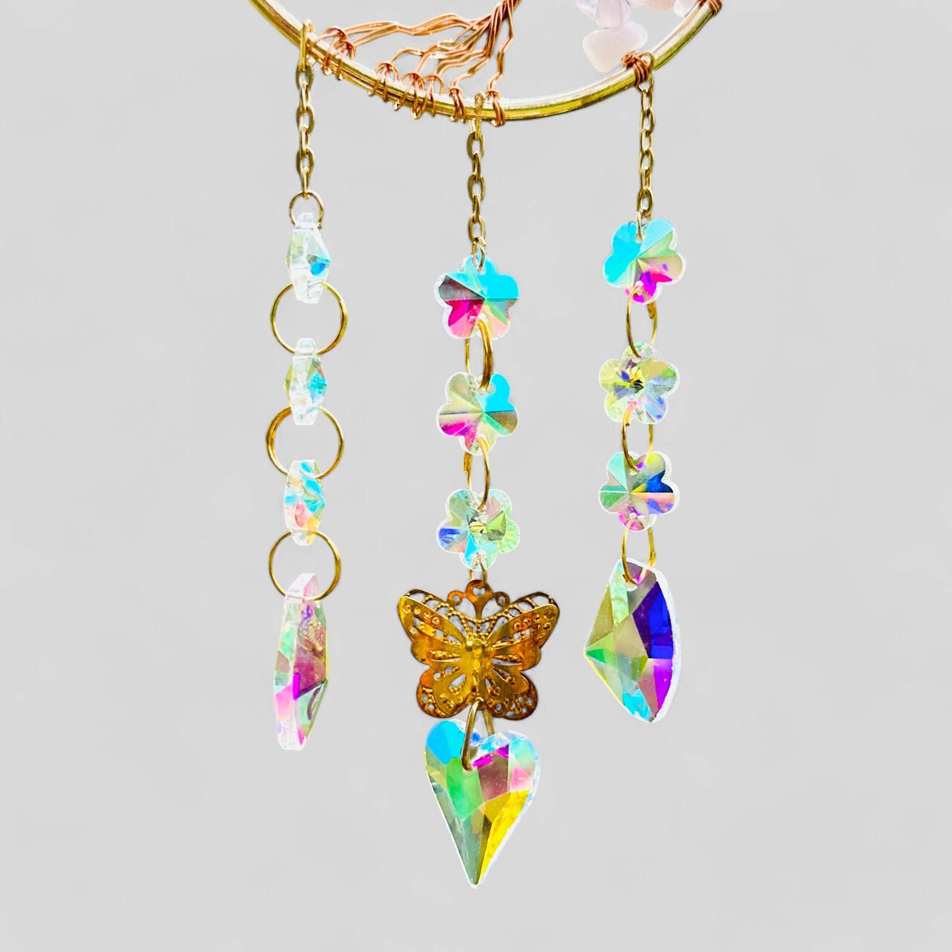 Il s’agit d’un capteur de rêves absolument magnifique et fait à la main qui peut être utilisé dans votre voiture ou votre maison. Il présente un style croissant de lune avec un arbre de vie fabriqué à partir de pierres de quartz rose et comporte 3 brins suspendus avec des perles prismatiques et une breloque papillon à plusieurs niveaux. Parfait pour votre véhicule, votre maison ou comme cadeau très spécial !
