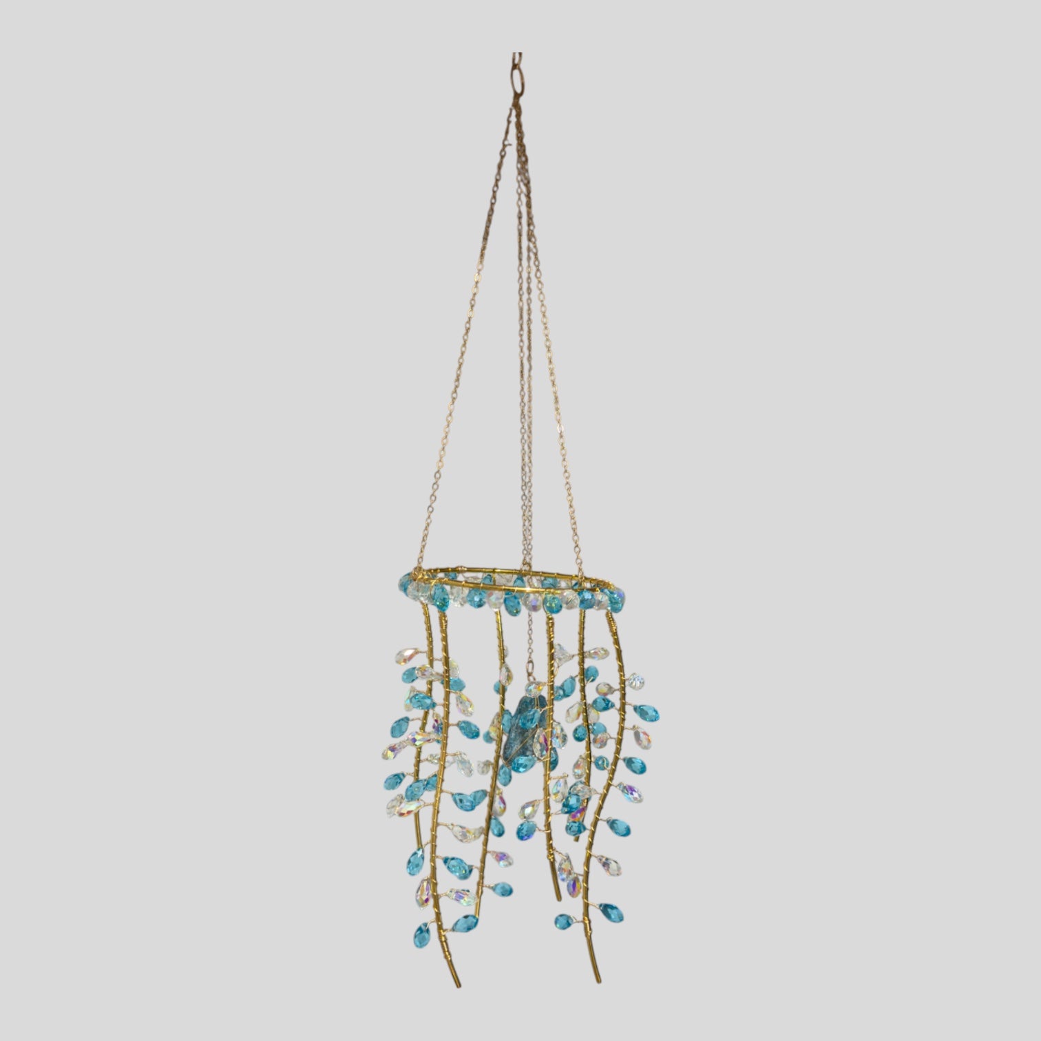 Hanging Gold Metal Suncatcher with Blue and Clear Prismatic Beads & Natural Stone