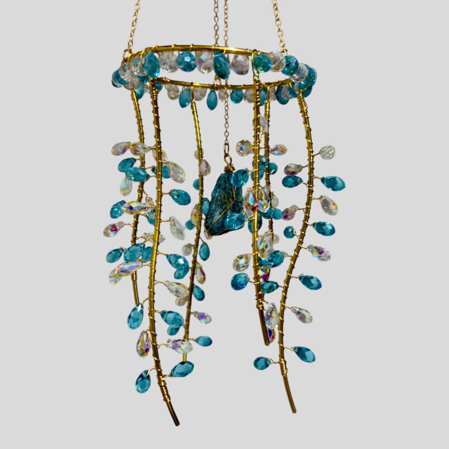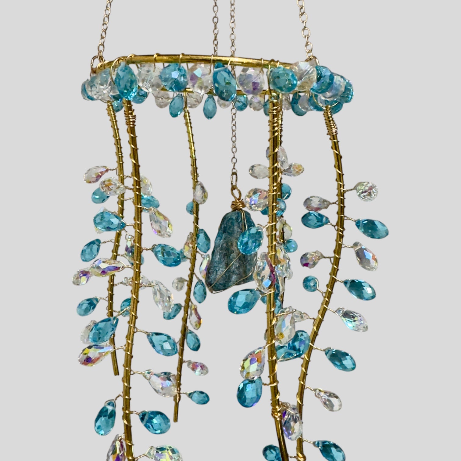 This exquisite handmade suncatcher showcases six wavy gold metal pieces adorned with blue and clear prismatic beads. At its center hangs a unique natural stone, adding a touch of elegance.