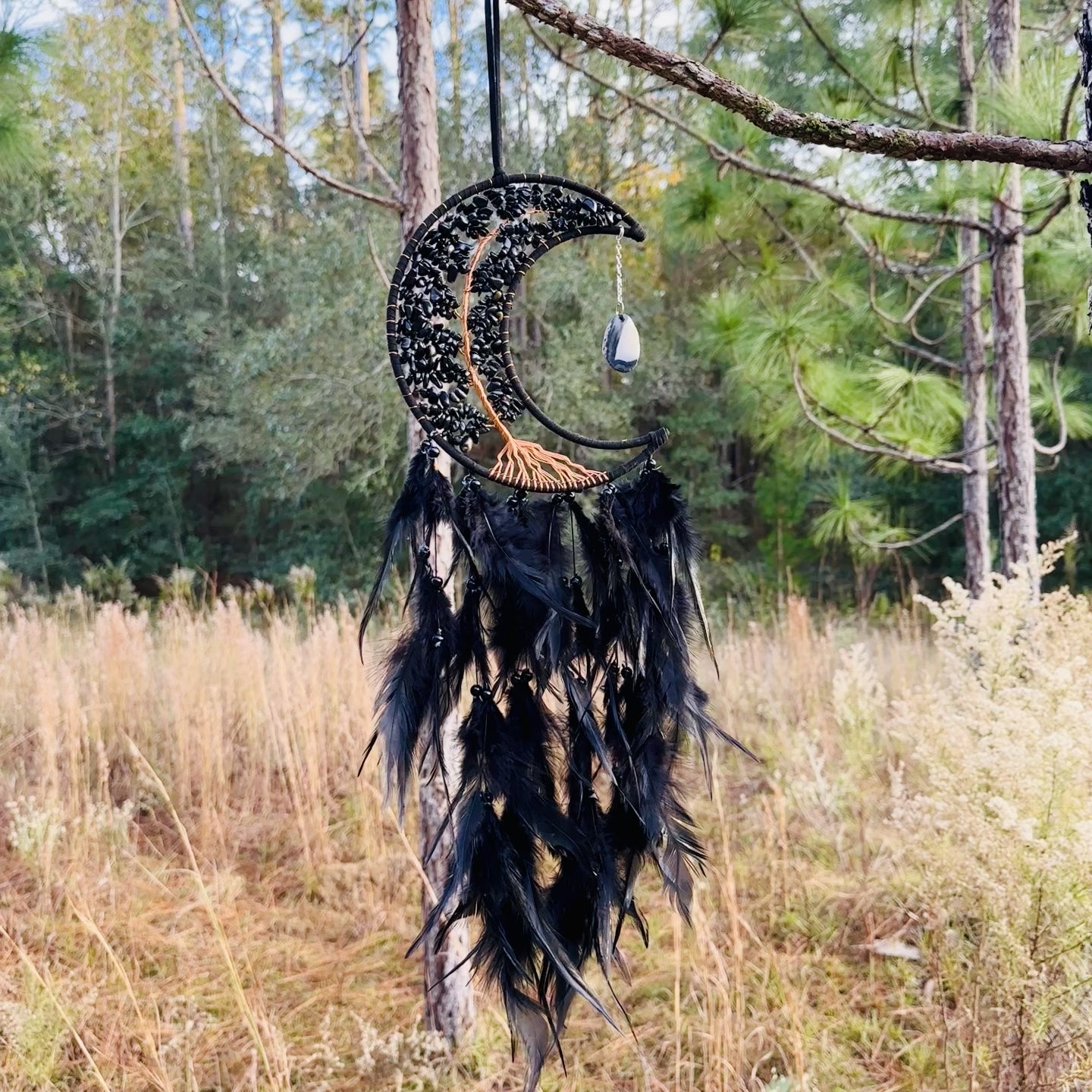 Attrape-rêves mural moyen en forme de croissant de lune avec pierres d'obsidienne noires et breloque en pierre suspendue avec plumes noircies, décoration d'intérieur moderne