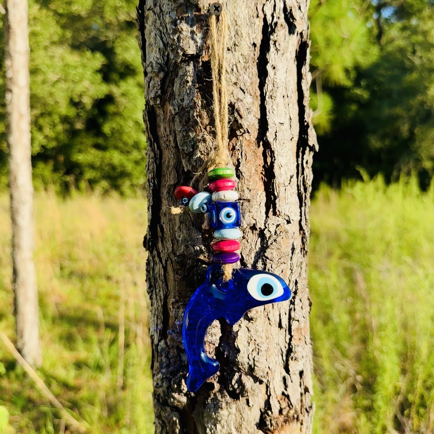 This wall-hanging evil eye features an evil eye in (nazar boncuk) in the shape of a dolphin made of handblown glass. It is adorned with a cube evil eye in the center of bright-colored wooden beads. This is truly what you have been looking for! Perfect for your home or office with stunning quality.