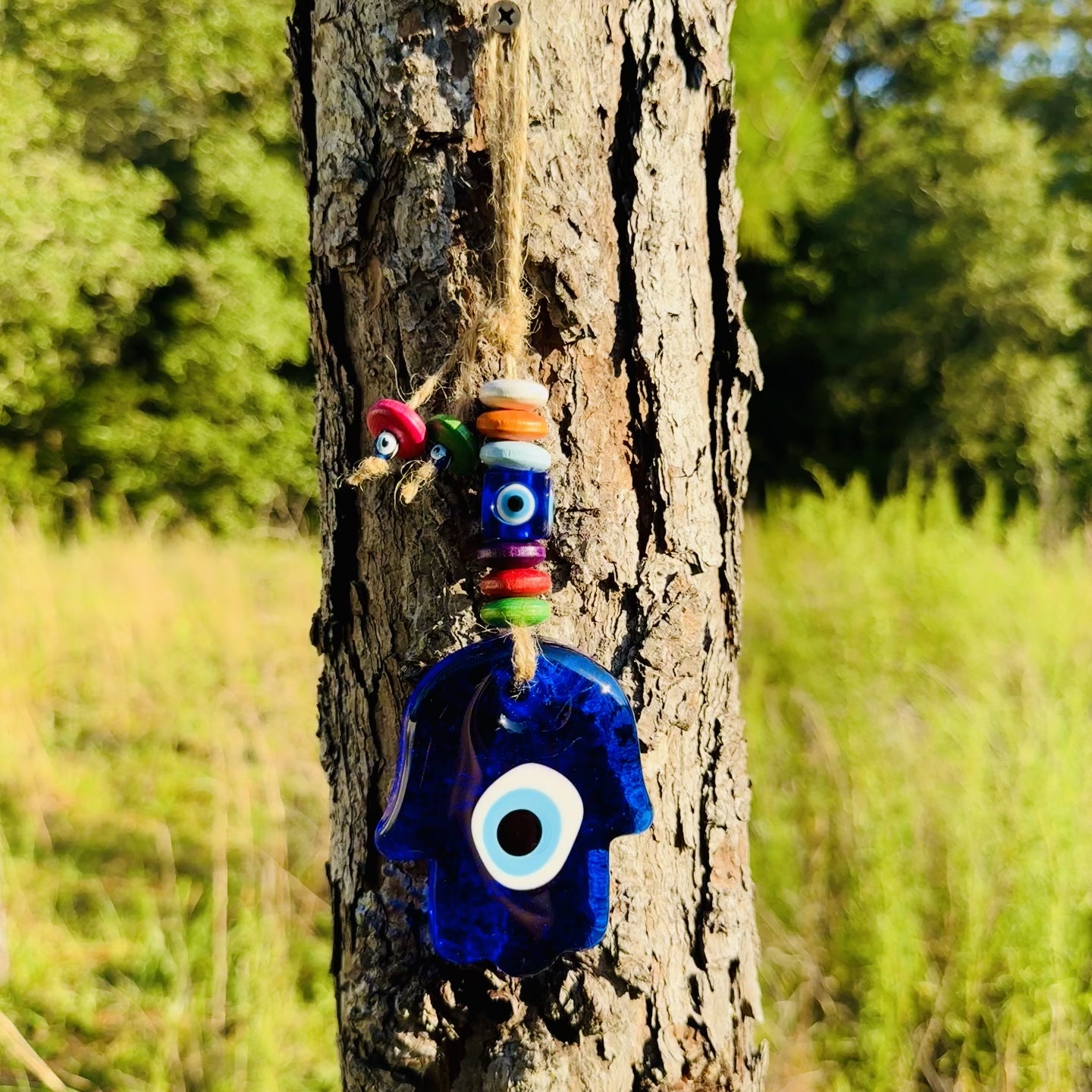 This wall-hanging evil eye features an evil eye in (nazar boncuk) in the shape of a hamsa hand made of handblown glass. It is adorned with a cube evil eye in the center of bright-colored wooden beads. This is truly what you have been looking for! Perfect for your home or office with stunning quality.