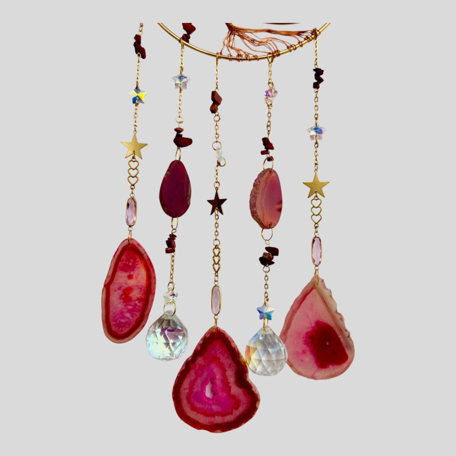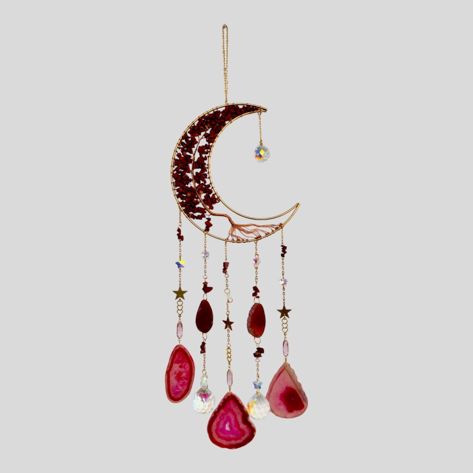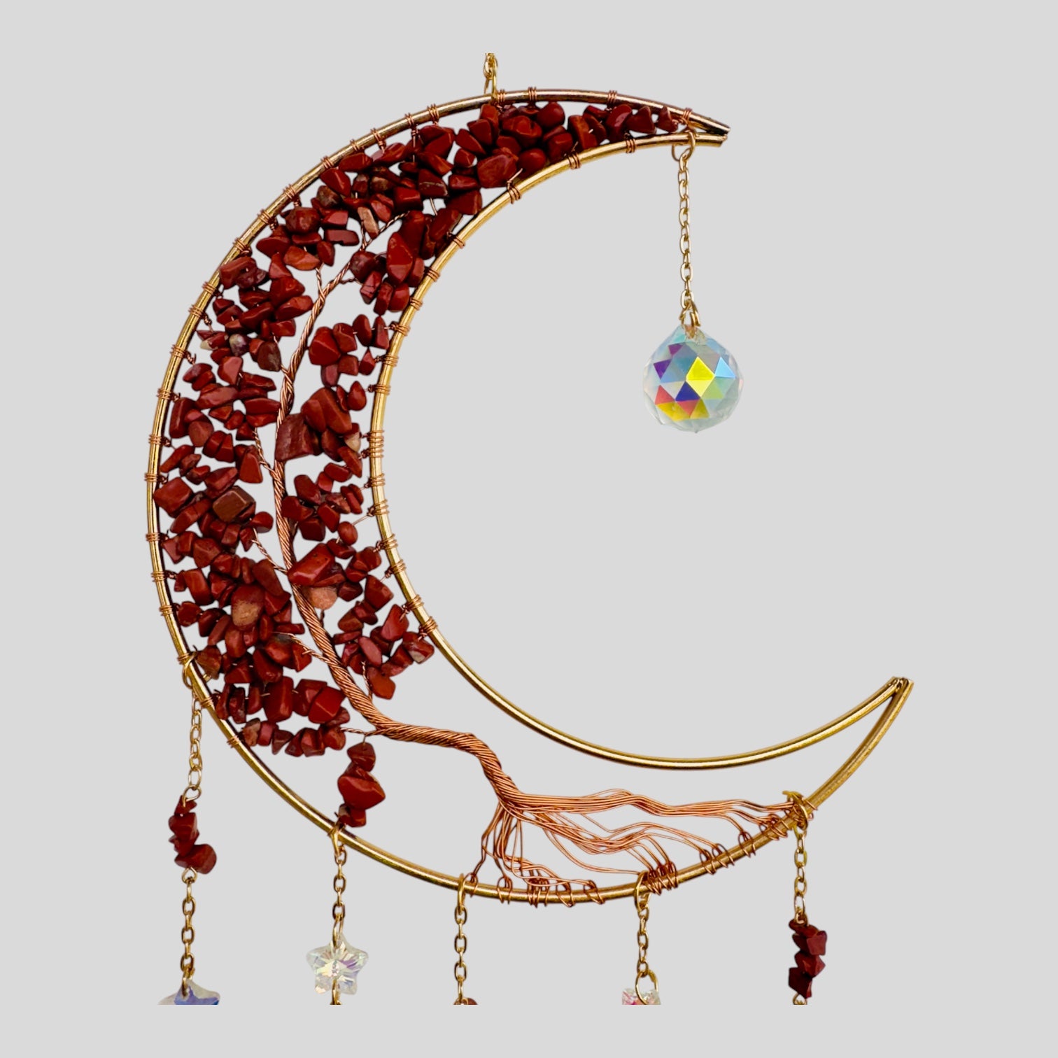 Cet attrape-rêves fabriqué à la main présente une pierre naturelle dans le croissant de lune enveloppée et tressée avec du fil de cuivre et une pierre suspendue en forme de lune.