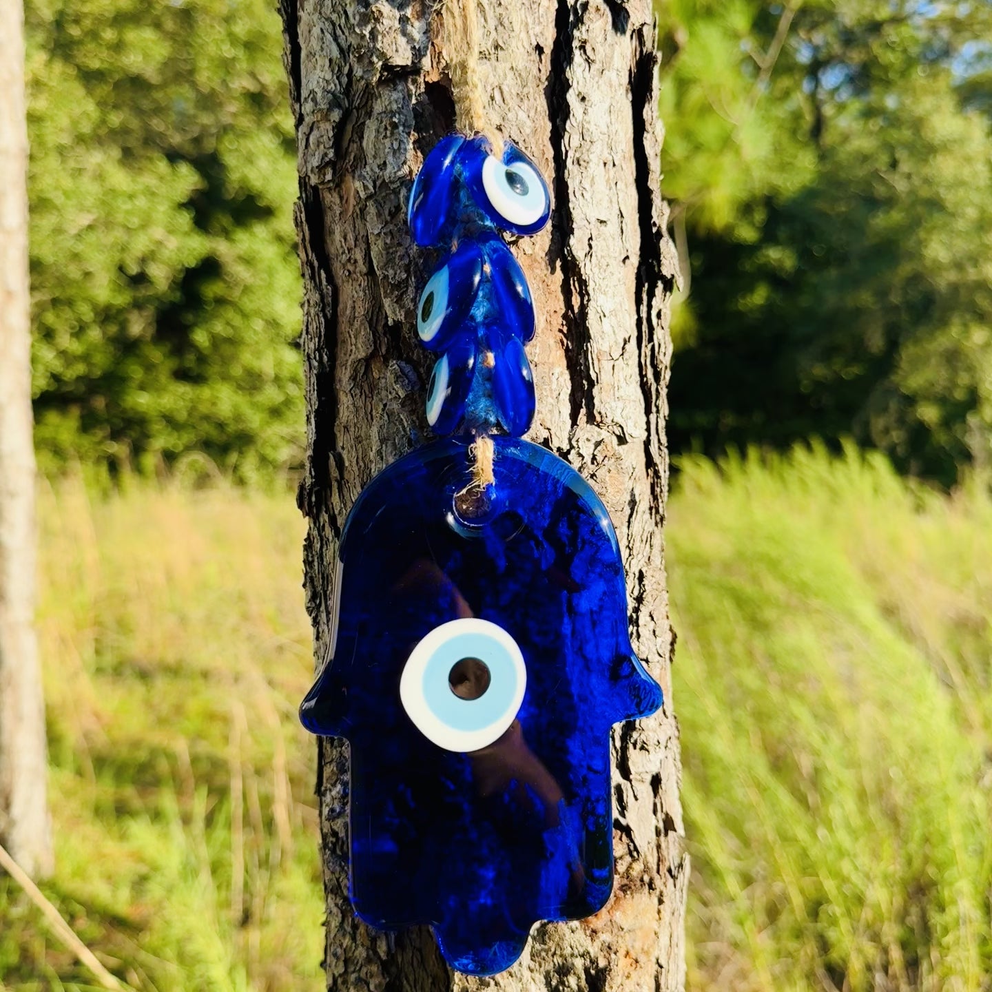 Handcrafted with meticulous attention to detail, our wall-hanging evil eye features 6 smaller evil eyes and a large blue evil eye charm, shaped like a hamsa hand. The vibrant blue hue symbolizes spiritual protection and wards off negative energy, bringing harmony and positivity to your surroundings.