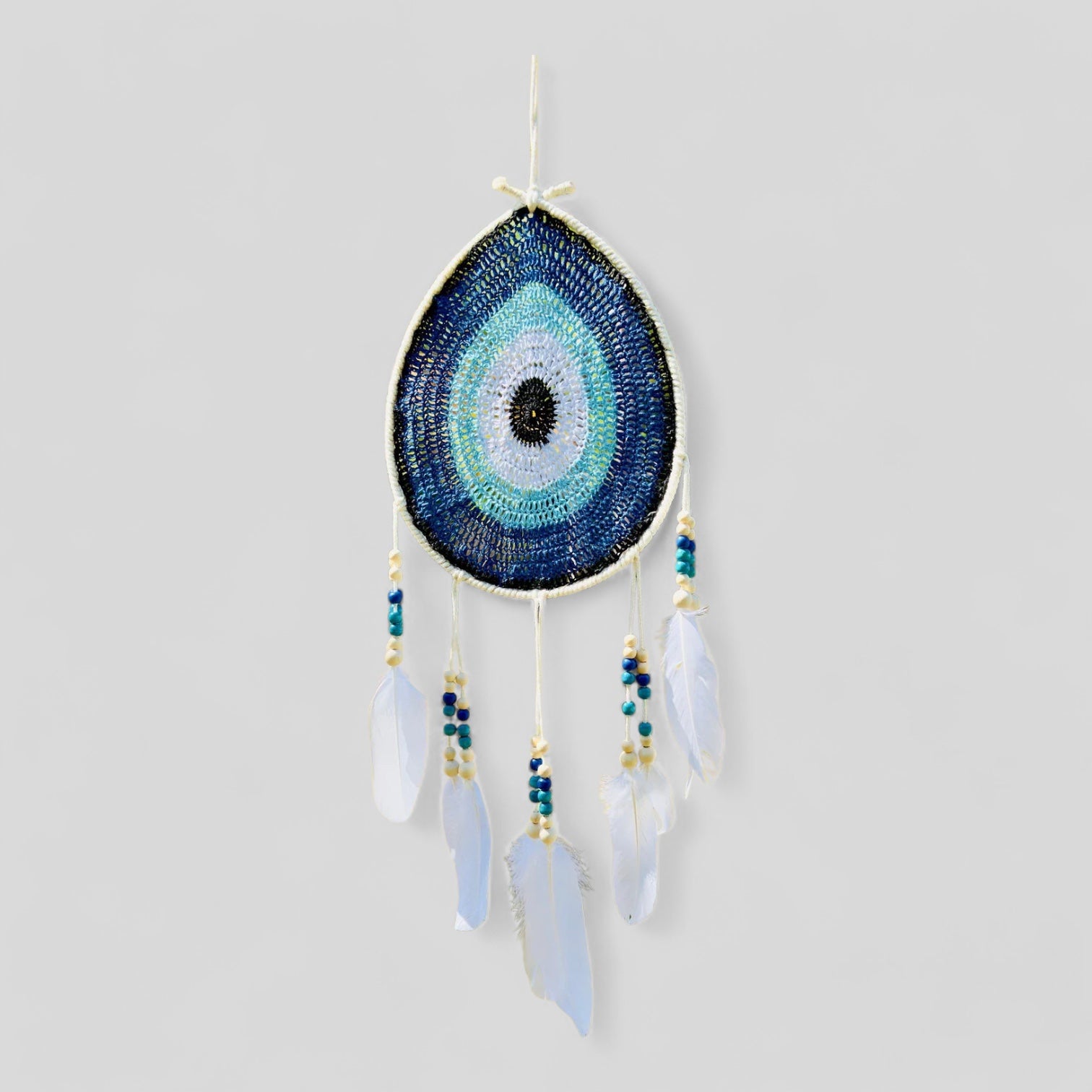 White Tear Drop Crochet Wall Hanging Evil Eye Nazar Boncuk Mal De Ojo Dream Catcher with Feathers, Modern Boho Style Home Decor