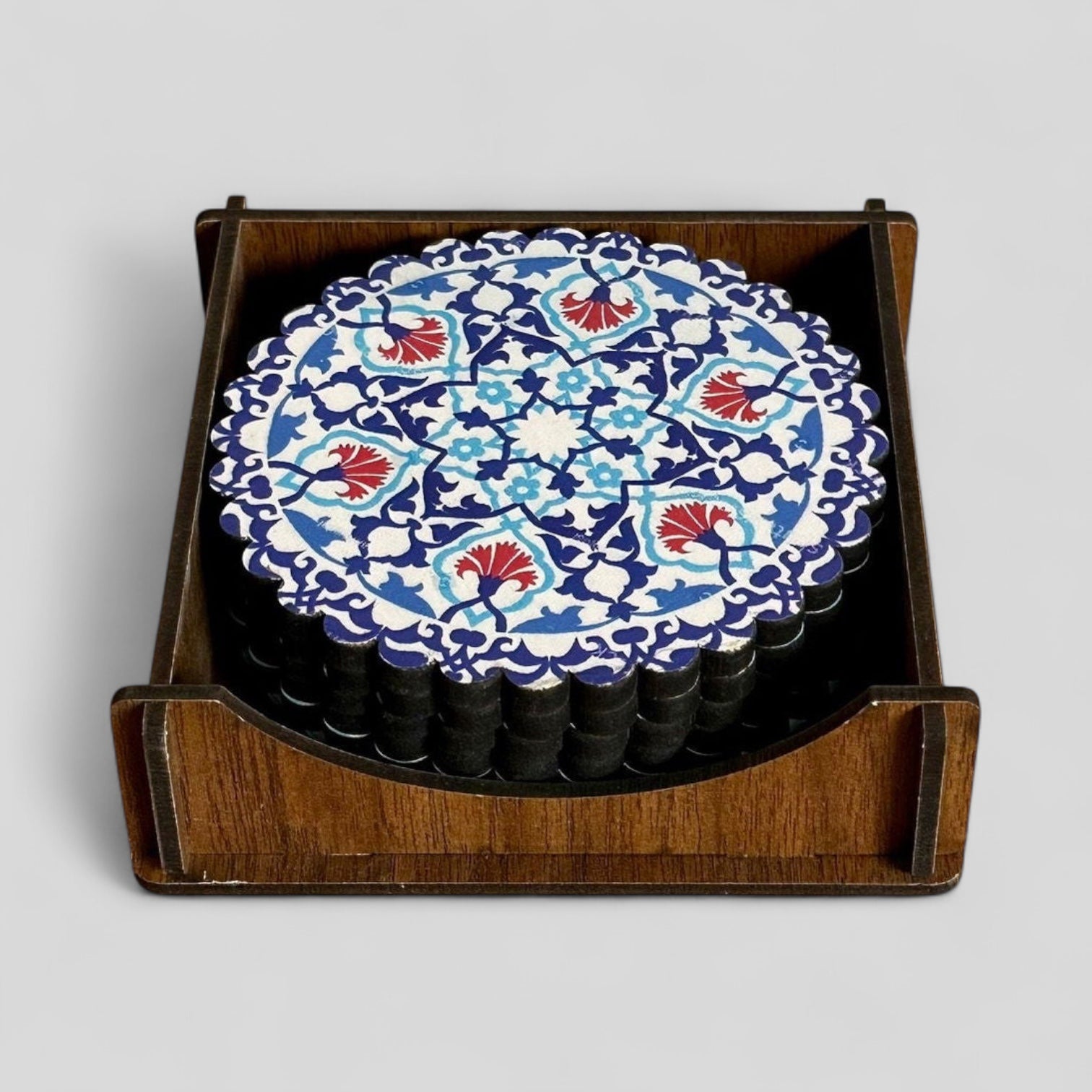 6 Pack Turkish Wooden Coaster Set with Holder - Blue and Red Floral Mandala -- Made in Turkey
