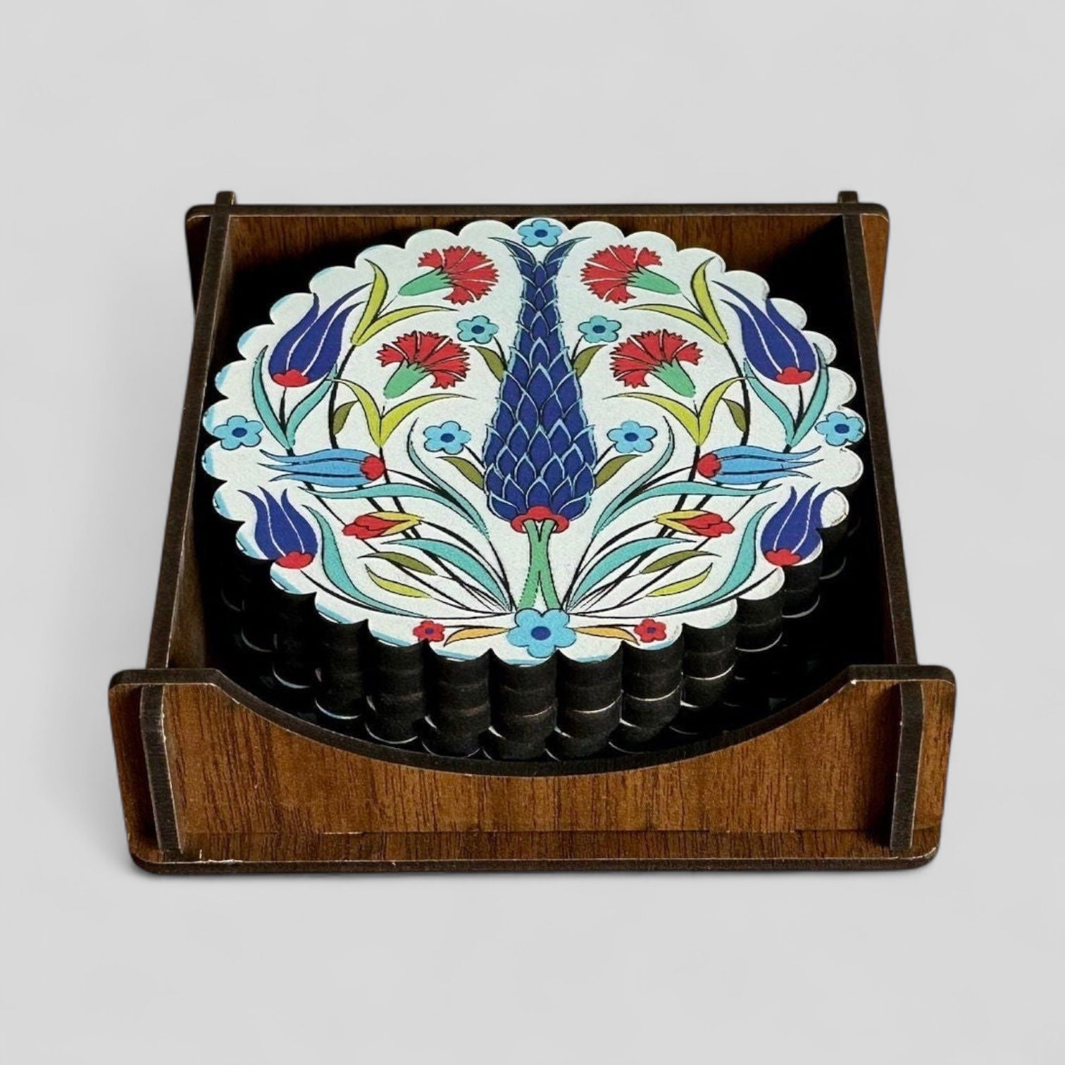 6 pack of wooden coasters with square storage holder. These coasters feature a traditional Ottoman tulip design. Safely place your glass on the table without worrying if you will damage the table.