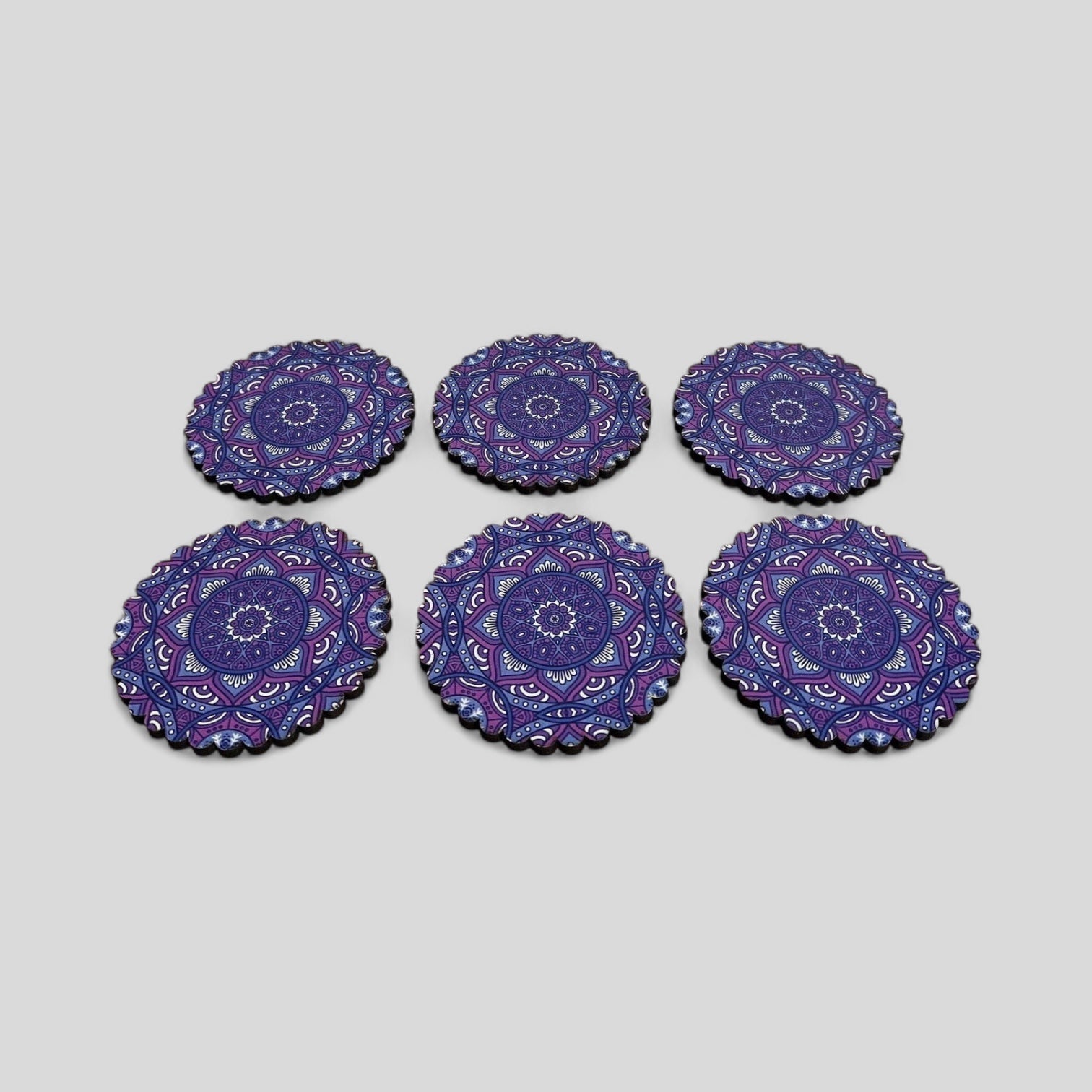 6 pack of wooden coasters with square storage holder. These coasters feature a dark purple floral mandala design. Safely place your glass on the table without worrying if you will damage the table.