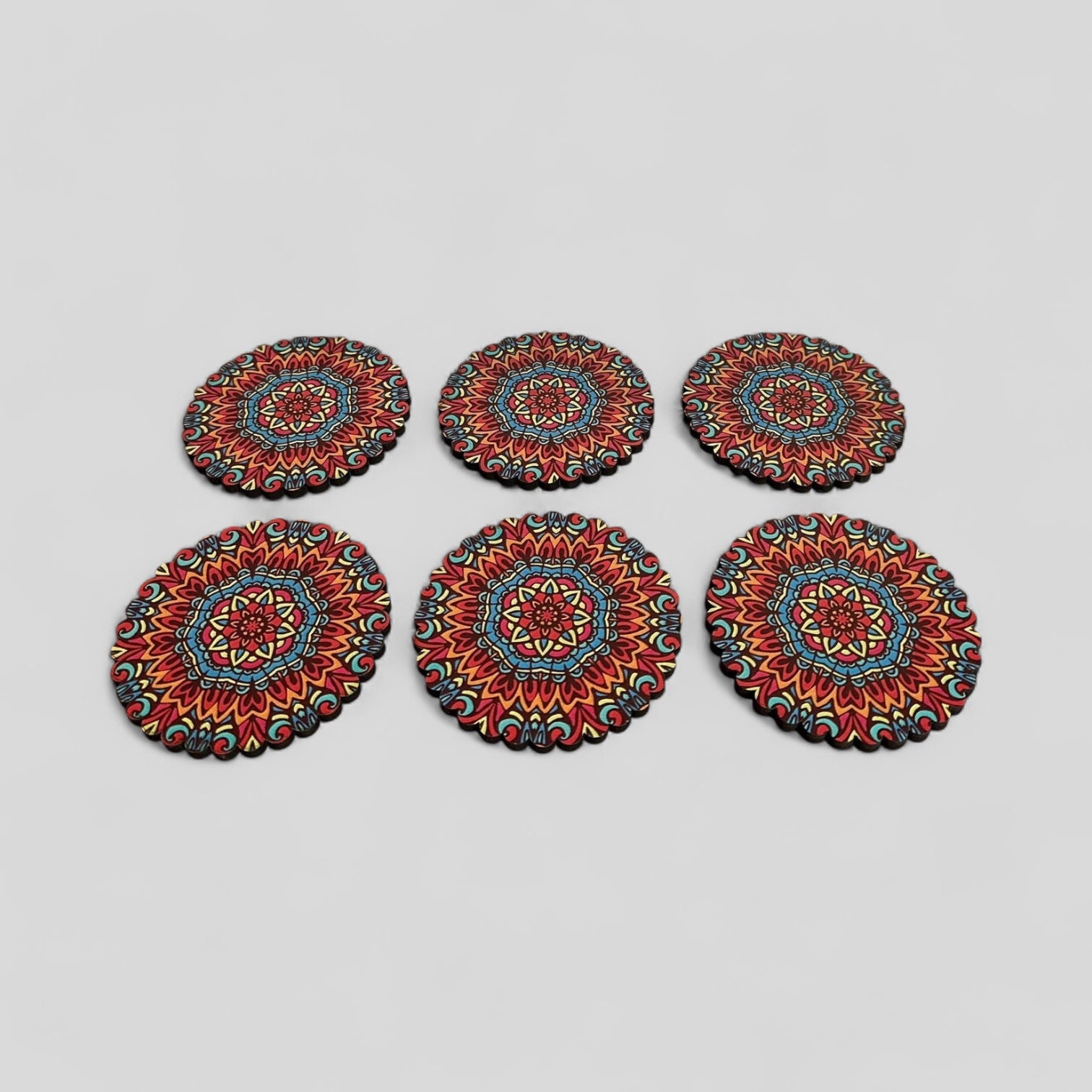 6 Pack Turkish Wooden Coaster Set with Holder - Red, Orange, Blue -- Warm Tone Mandala -- Made in Turkey